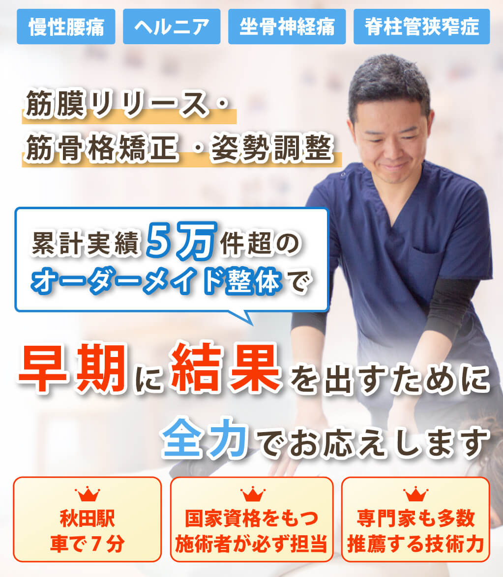 当院では、整骨院やリハビリ施設で様々な臨床経験を積み、累計実績5万件以上と柔道整復師の国家資格を持つ院長が徹底した技術指導をした施術者が担当しますので、一人ひとりに合わせたオーダーメイド整体が可能です。